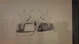 Hace un par de semanas, estuve participando en Nuevas Culturas Urbanas, unas Jornadas que se celebraron en Seúl y que fueron organizadas desde Casa Asia. Yo iba para representar al Movil Film Fest y a hablar de creación y tecnología de comunicación móvil en un marco que acogía a otros muchos temas de la cultura urbana tanto de España como de Corea, y en torno a estas Jornadas, se realizó una exposición en el mismo lugar que acogía este evento, el centro cultural KT & T Sangsang Madang, comisariada por Blanca Soto y titulada Ni un solo día sin una línea. Dibujo español contemporáneo. La tecnología no se encuentra únicamente en las obras de media art o de arte electrónico o digital, se encuentra en muchas de las obras que se crean actualmente, porque el arte refleja la sociedad, lo que sucede, lo que nos rodea, en lo que nos convertimos, lo que nos atemoriza, lo que deseamos…. Así que allí estaba yo, disfrutando de los trazos sobre el papel, de líneas a veces muy simples y otras tan complejas, inquietantes, divertidas, oníricas, realistas… Había de todo para mostrar el amplio registro del dibujo actual español de los jóvenes creadores pero en varias de las obras estaba presente la tecnología y en especial los teléfonos móviles.